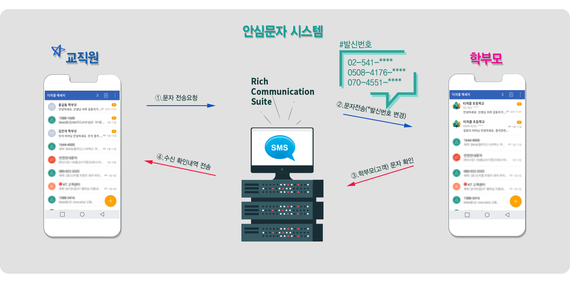 학교 대표번호, 반 전화번호, 안심번호등을 발신번호로 설정하여, 개인전화번호 노출없이 학부모(고객)과 문자전송을 가능하게 하는 서비스입니다.